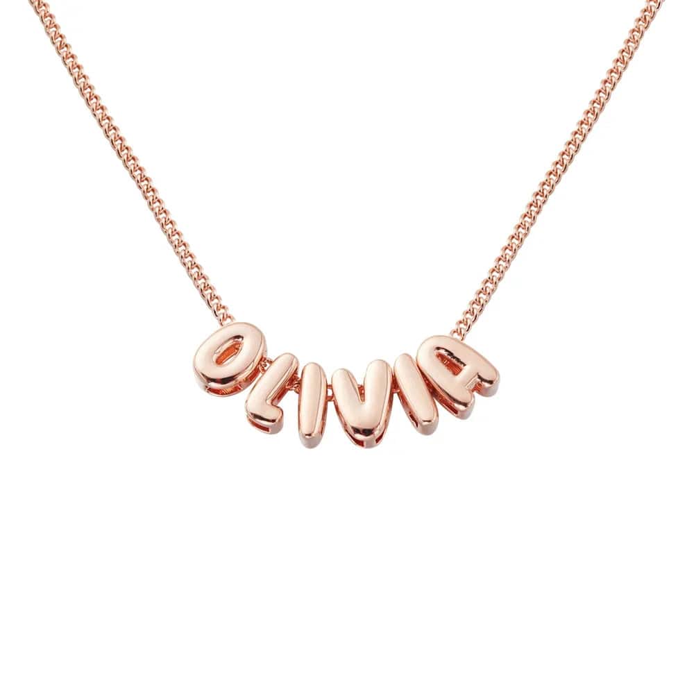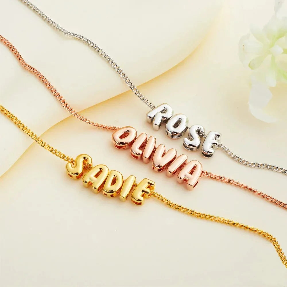 Discover the personalized bubble letter name necklace made of 18-karat gold-plated stainless steel—a stylish accessory that highlights your personality. With up to three letters, you can wear your initials or those of your loved ones. Choose between silver, gold, and rose gold to perfect your individual look. This necklace is durable, high-quality, and suitable for both everyday wear and as a special gift. Available in different lengths and delivered to you within 1-2 business days.