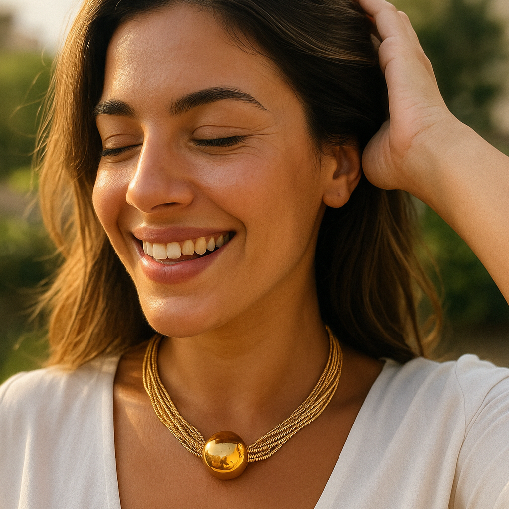 - Warm Skin Tones: Do you have skin with a yellow, olive, or peachy undertone? This skin type is often seen in women of Mediterranean, Middle Eastern, or Latin American descent. Jewelry in colors such as yellow gold and rose gold accentuate the warmth in your skin and make you glow with a soft, radiant glow. Our gold-colored necklaces and bracelets are perfect for you because they emphasize your natural beauty without overpowering it.