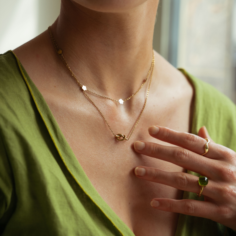 - Warm Skin Tones: Do you have skin with a yellow, olive, or peachy undertone? This skin type is often seen in women of Mediterranean, Middle Eastern, or Latin American descent. Jewelry in colors such as yellow gold and rose gold accentuate the warmth in your skin and make you glow with a soft, radiant glow. Our gold-colored necklaces and bracelets are perfect for you because they emphasize your natural beauty without overpowering it.