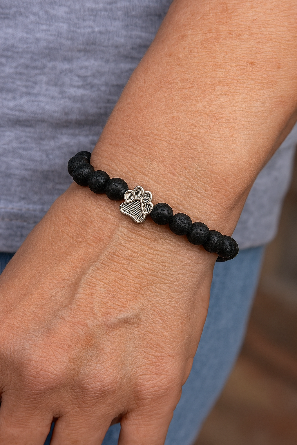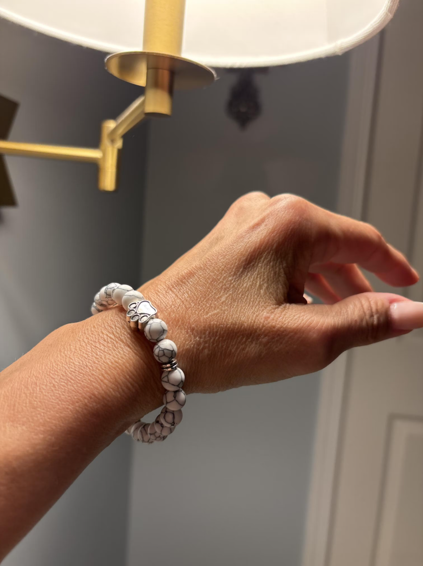 Our handmade beaded dog paw bracelet helps increase the bond with your dog. Simple wear it during your moments together (morning walks, binging movies on the couch) and show/touch your bracelet visibly to your dog while you show him love and attention. After a while it will remind your four-legged friend of "This is our time. You're fully here with me."