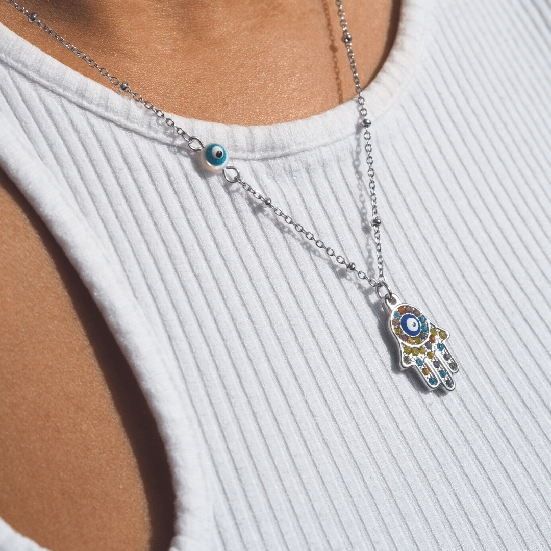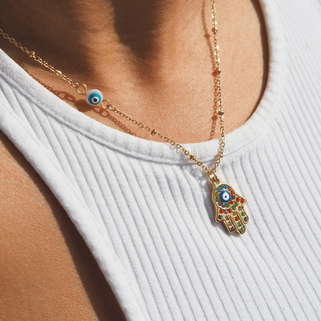 This 18K gold-plated stainless steel necklace features a hand pendant embellished with colorful crystals. The pendant not only offers an eye-catching design, but is complemented by a protective eye, which symbolizes positive energy and protection. The necklace is available in gold and silver and can be paired with a variety of looks. Perfect for anyone looking for a special piece of jewelry with spiritual meaning.