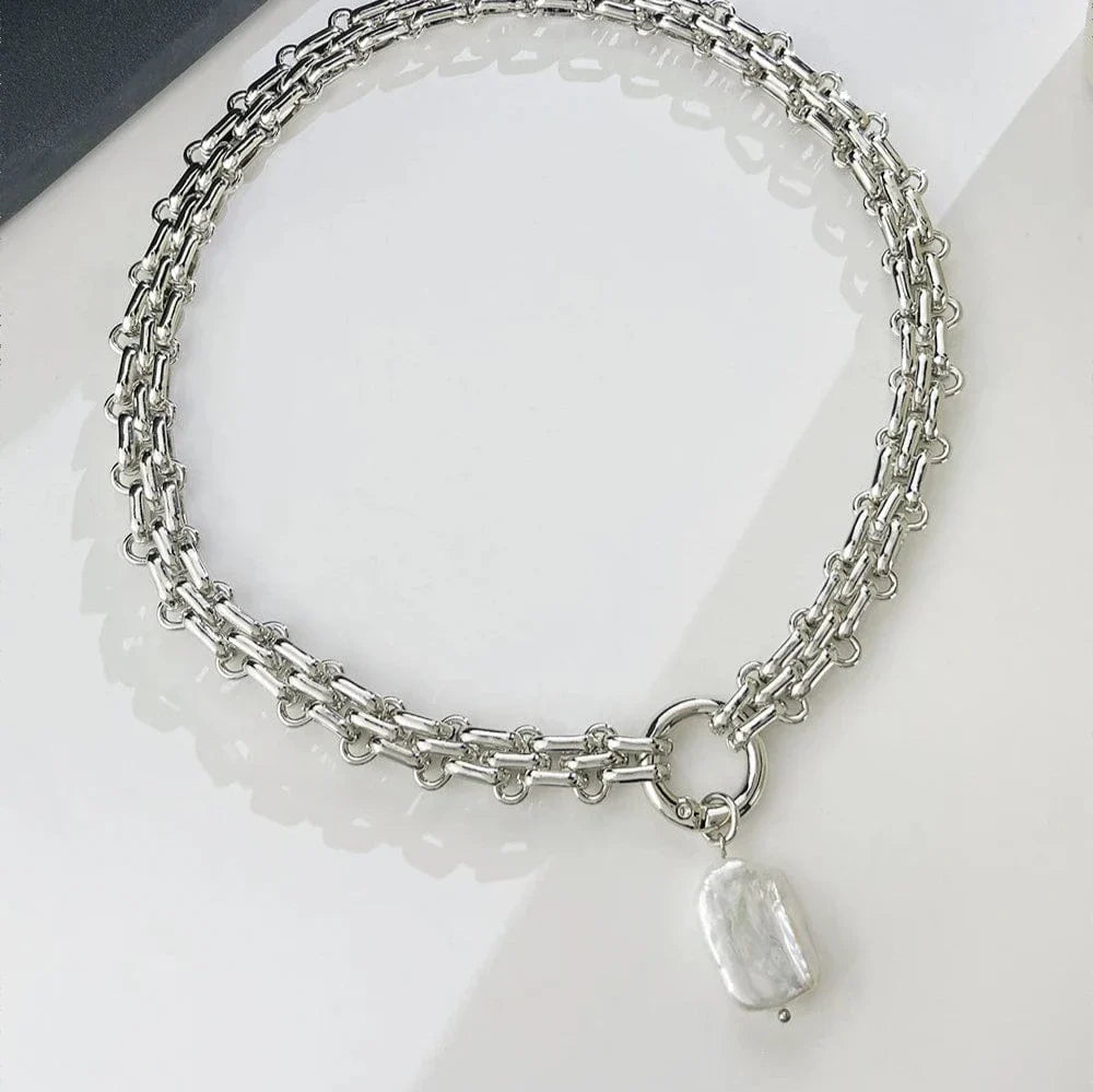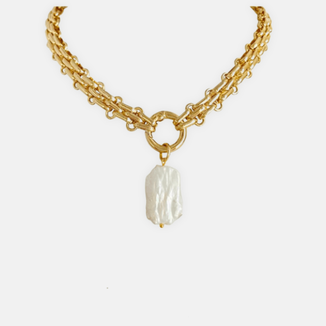 The Santina necklace is the epitome of elegance and expressiveness. With its robust design made of 18-karat gold-plated stainless steel, it makes a strong fashion statement and attracts everyone's attention. The heavy, double chain gives the necklace a striking look that can be perfectly combined with a simple outfit to instantly elevate it to a new level. The highlight of the Santina necklace is the large, irregularly shaped pendant, which is made from natural pearls and gives each piece its own unique, individual touch. Available in silver and gold, the necklace adapts perfectly to your style and personality.