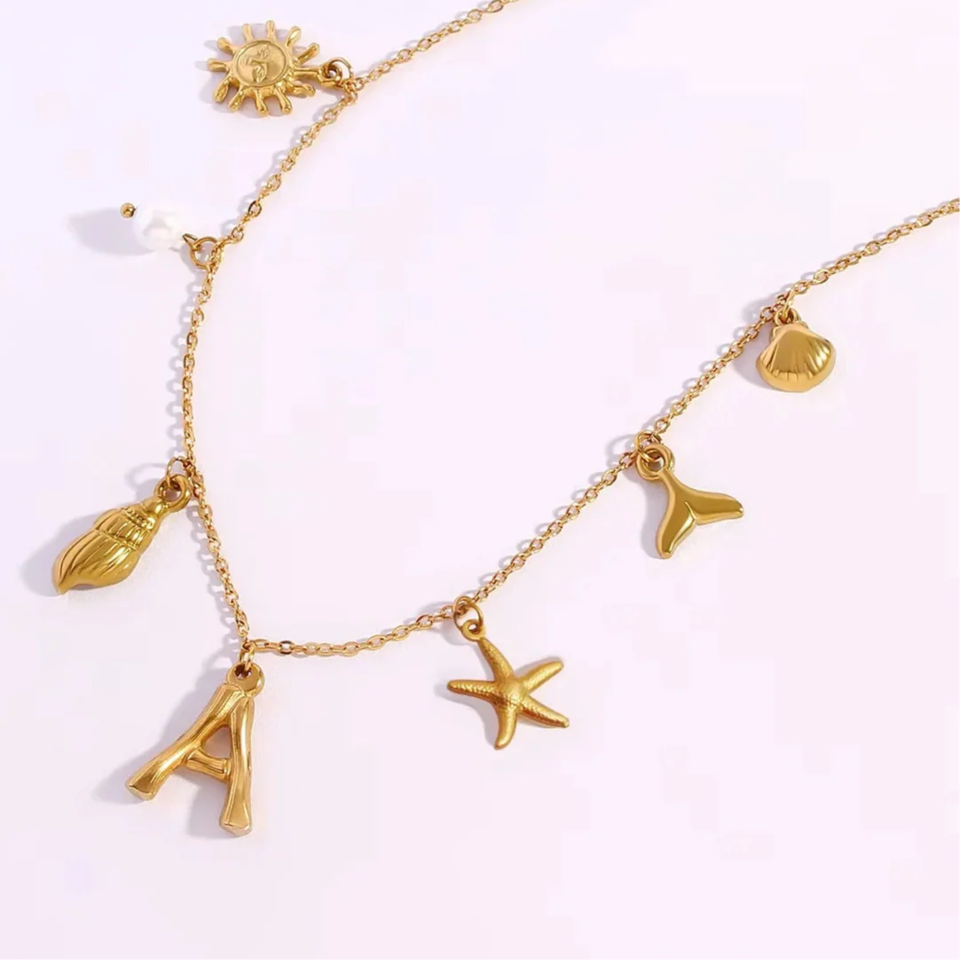 Make a stylish statement with the Seastar Letter Necklace, inspired by the sun, beach, and sea. This high-quality necklace combines maritime charms—such as starfish, shells, pearls, sun pendants, and more—with a letter pendant of your choice. This makes it your very own personal piece of jewelry.
