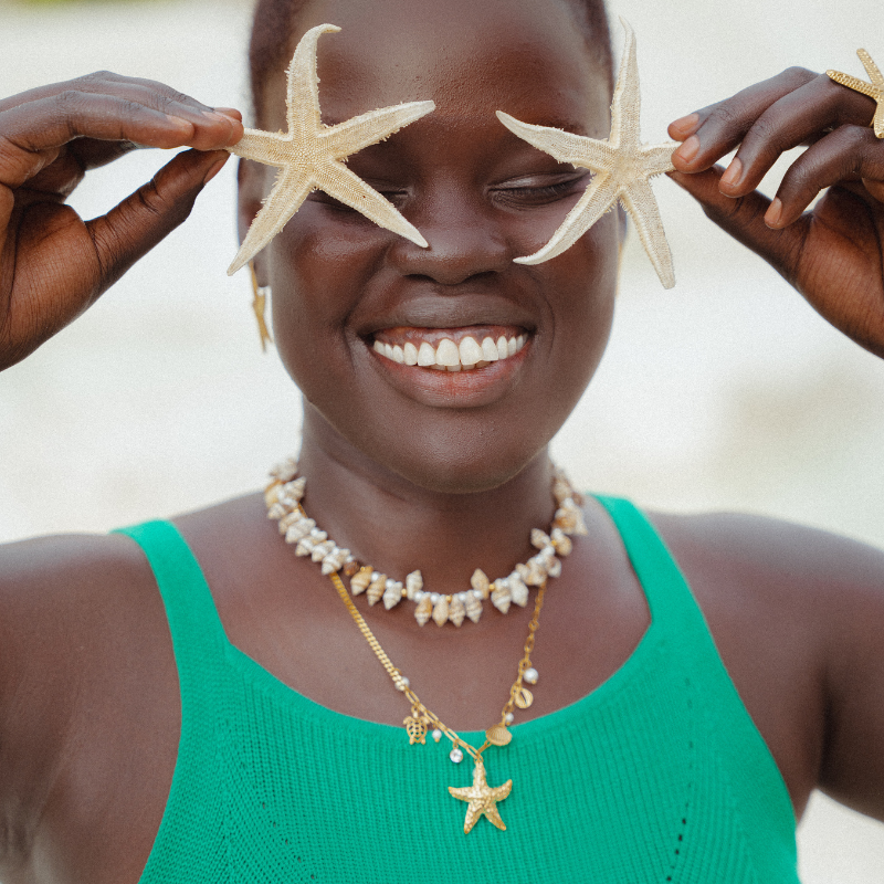 A whole lineup of beachy shells strung together basically summer in necklace form. Waterproof, everyday-chic, and the ultimate vacay vibe.