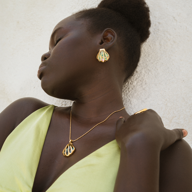 Ocean vibes, but make it glam golden shells with a splash of iridescent magic.