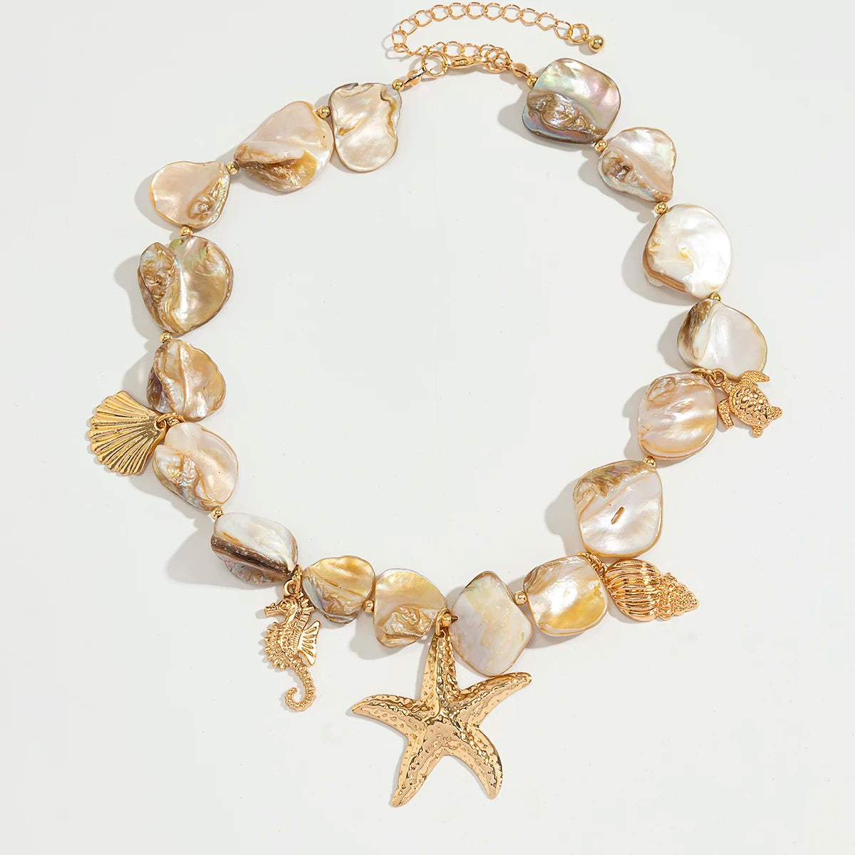 With the Stella Marina necklace, you can bring the magic of the coast straight into your jewelry box. Lovingly strung natural shell pearls form the base, while delicate 18K gold-plated charms in the shape of starfish, seahorses, and shells make each piece unique.